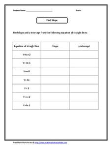 In this slope worksheet, students identify the slope and y-intercept when given a linear equation. All equations given are listed in the y = mx + b format. This two page worksheet contains seven problems. Answers are provided on the last...
