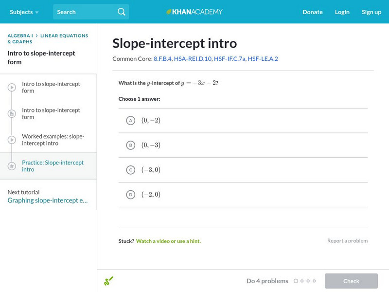 Practice your basic understanding of slope-intercept form for linear equations. Students receive immediate feedback and have the opportunity to try questions repeatedly, watch a video or receive hints.