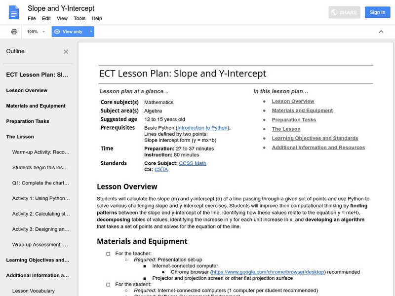 Students calculate the slope and y-intercept of a line passing through a given set of points. Use Python to solve various challenging slope and y-intercept exercises.
