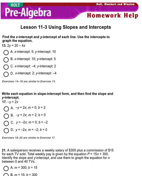 Holt, Rinehart and Winston: Homework Help Independent Practice: Using Slopes and Intercepts