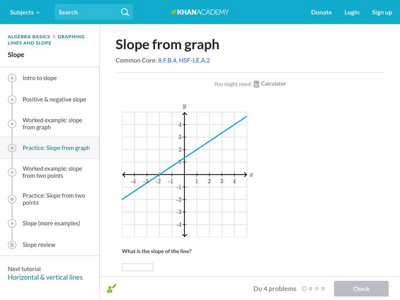 In this exercise, students practice constructing a linear equation for a line graph in order to find the slope. Students receive immediate feedback and have the opportunity to watch a video, get hints, or try questions repeatedly.