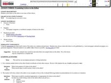 Students write letters to the editor. In this written communication instructional activity, students read sample letters to the editor and use the active voice to compose letters to the editor about issues in which they are interested.
