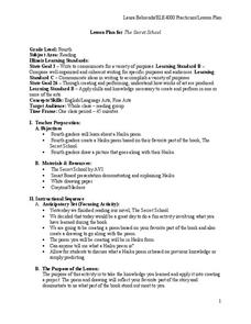 Fourth graders complete an activity with the book The Secret School by AVI. In this literacy instructional activity, 4th graders finish the story and write a Haiku poem describing their favorite part of the story.