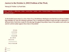 In this algebra worksheet, students decipher a cryptogram to find the numbers on Cal's uniform. There is an answer key to this problem.