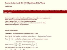 For this algebra worksheet, students analyze a word problem and figure out how many males and females are in their class. There is an answer key to this question.