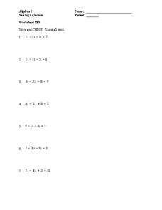 For this algebra worksheet, students solve linear equations using the distributive property. They isolate and solve for the unknown. There are 7 questions.