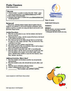 Students use fruit counters. In this patterns lesson, students identify different fruits, sort the fruits by color, shape and size, and make a pattern using the fruits.