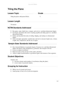 Fifth graders use pattern blocks and triagular grid paper to reivew shape names, be introduced to the concept of a tiling of the plane, and determine which pattern blocks tile the plane. They are asked if they comprehend what a...