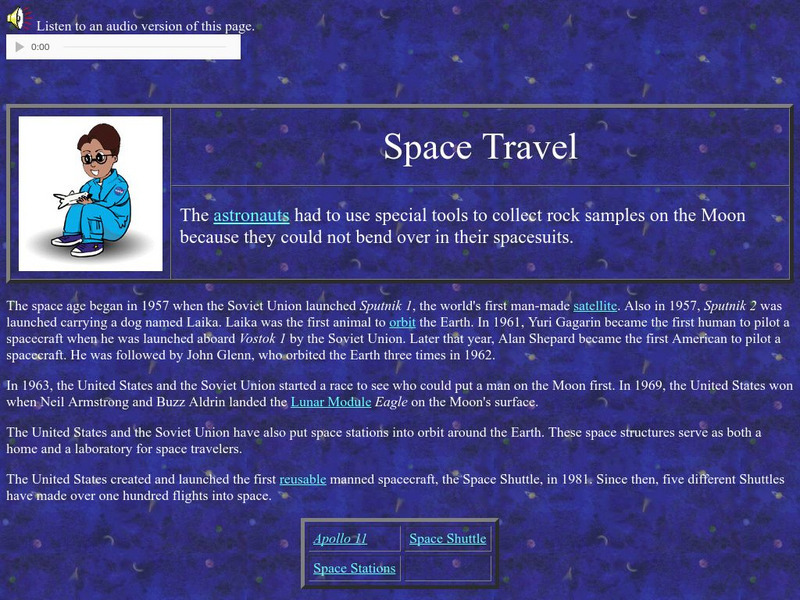Learn about the history of space travel. Audio content is included as well as vocabulary words linked to a glossary of terms.