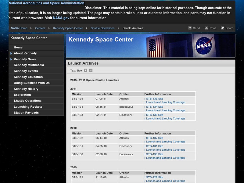 A menu page for selecting information on any of the space shuttle missions from 1981 to the present. Each mission profile includes crew list, dates, and mission highlights. Each mission insignia is shown on the mission summary page.