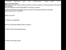 In this space worksheet, students click on the links in the questions about space to find the answers to the questions and then come back and answer the questions. Students answer 17 questions total.