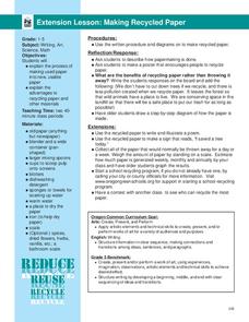 Students explore the advantages of recycling paper. In this environmental lesson plan, students produce recycled paper by ripping up paper and putting it into a blender with water to create a mixture. Students use their recycled paper to...