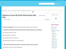 In this online interactive reading comprehension worksheet, students respond to 12 multiple choice questions based on Robinson Crusoe. Students may submit their answers to be scored.