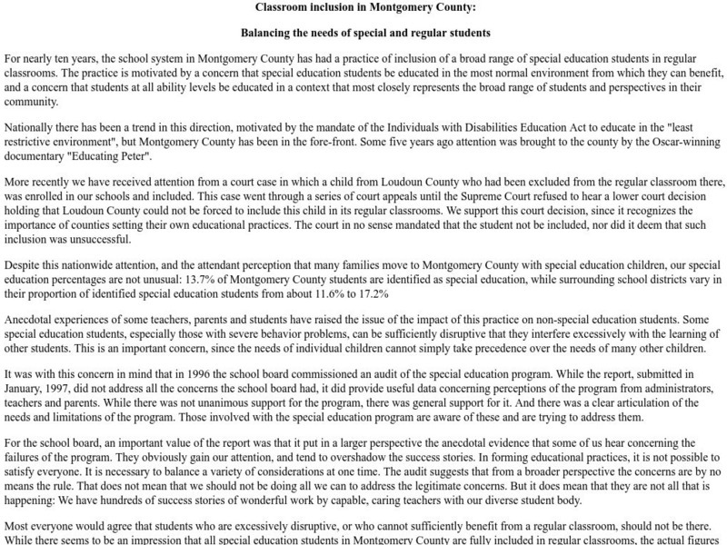 This well-written article provides a discussion of inclusion of students with special needs, and is written in reference to the Montgomery County public school district in Virginia. The article provides an interesting and informative...