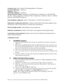 How do you describe a jellyfish? Individuals write adjectives for Nomura's jellyfish, take notes, and check understanding with a formative assessment. Notes include the definition for adjectives, guiding questions to help writers...