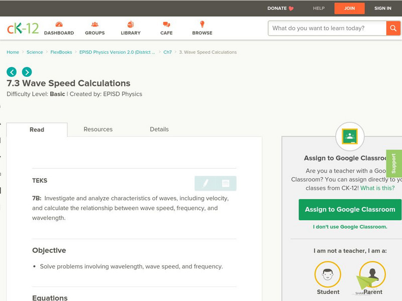[Free Registration/Login may be required to access all resource tools.] Students investigate and analyze characteristics of waves, including velocity, and calculate the relationship between wave speed, frequency, and wavelength.