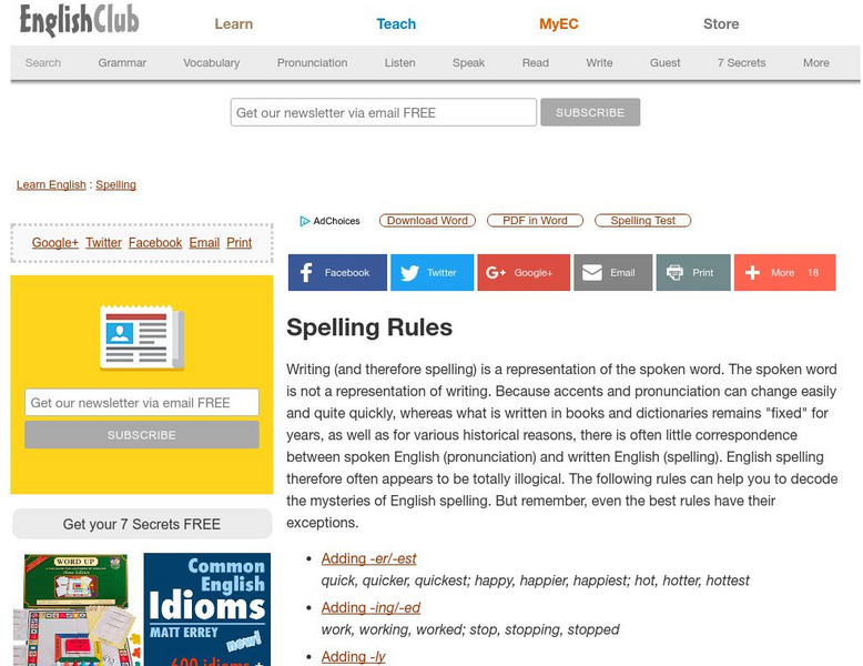 This EnglishClub tutorial provides rules for spelling words. Spellings related to using -ei-, -ie-, -ible, -able, -er, -est, -ed, -ing, -ly, and -s are featured. These are followed by a link to a large set of spelling quizzes.