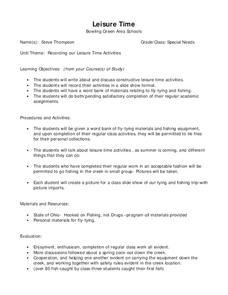 Learners write about and discuss personal leisure time activities and record their activities in a slide show format to present to their classmates. They work off a word bank of materials relating to fly-tying and fishing after all other...
