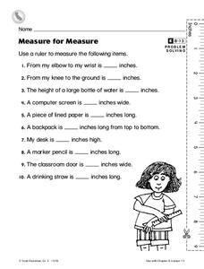 In this standard measurement worksheet, students solve 10 problems in which body parts and classroom objects are measured in inches. A paper ruler is provided.