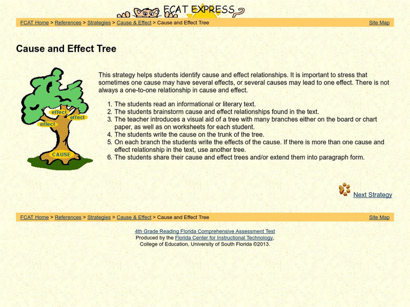 Strategy to help students recognize cause and effect relationships provided by a standardized test preparation site intended for fourth grade. Includes simple instructions and a visual.