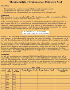 Students determine the number of ionizable hydrogen's in an unknown acid and determine the equivalent weight of an unknown acid. They determine the enthalpy change for the ionization of an unknown acid.