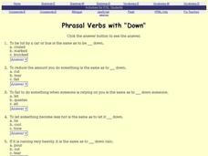 In this phrasal verbs activity, students complete a 10 question multiple choice on-line interactive quiz about the meanings of phrasal verbs with "down". Examples: let down, cut down, cool down.