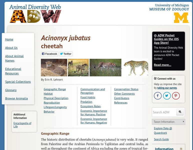 In addition to providing detailed information about the cheetah, Animal Diversity Web also offers a wealth of pictures, specimens, and classification information for detailed study.