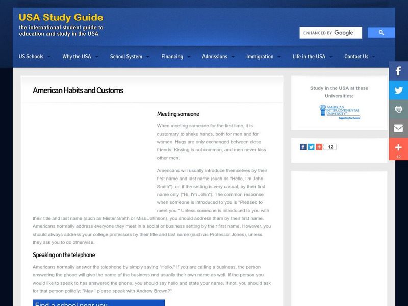 Concise information on American customs and habits aimed at older students. With coverage on meeting new people, introductions, speaking on the phone, eating out, tipping, and smoking. Also includes extensive internal links to other...