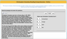 Scholars use their reading comprehension skills to answer questions about a short informative text regarding Christopher Columbus. A progress report follows eight questions—multiple-choice and fill-in-the-blank.