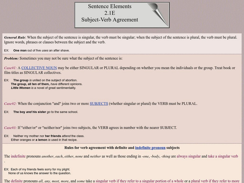 After defining subject-verb agreement and giving examples, this site answers several frequently asked questions about subject-verb agreement. Links to separate exercises are provided.