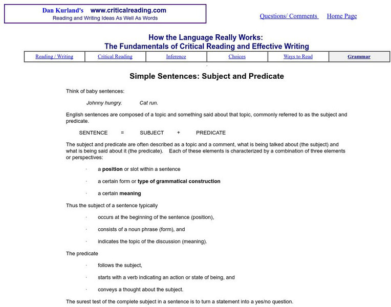 Part of a larger site on "The Fundamentals of Critical Reading and Effective Writing," this section on the simple sentence focuses on the subject and the predicate. Definitions and examples are provided along with a section on...
