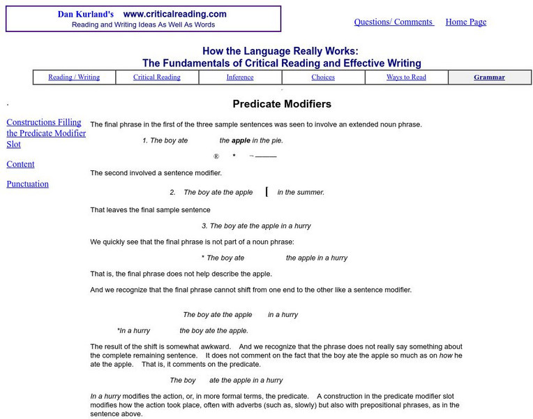 Part of a larger site on "The Fundamentals of Critical Reading and Effective Writing," this section on the predicate modifier contains numerous examples of the modifier along with punctuation tips.