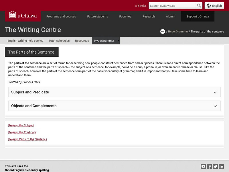 This University of Ottawa site overviews the parts of the sentence and then provides a list of links to the various individual parts including subject and predicate, objects and complements, noun, pronoun, phrase, clause, and a review...