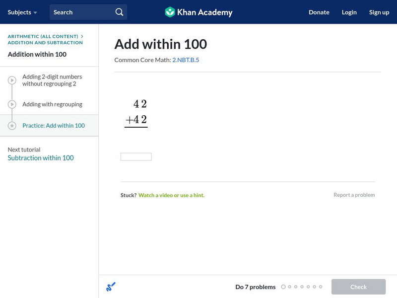 In this exercise, students practice addition within 100. Students receive immediate feedback and have the opportunity to watch a tutorial video get hints, and try questions repeatedly. CCSS.Math.Content.3.NBT.A.2 Fluently add and...