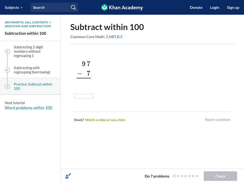 In this exercise, students practice subtraction within 100. Students receive immediate feedback and have the opportunity to watch a video tutorial, get hints, and try questions repeatedly. CCSS.Math.Content.3.NBT.A.2 Fluently add and...