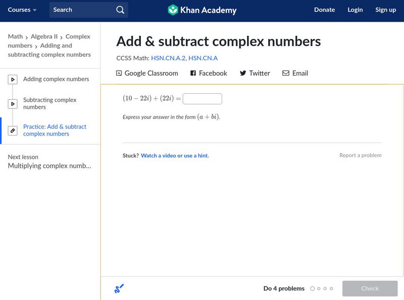Practice addition and subtraction with complex numbers. Students receive immediate feedback and have the opportunity to try questions repeatedly, watch a video or receive hints.