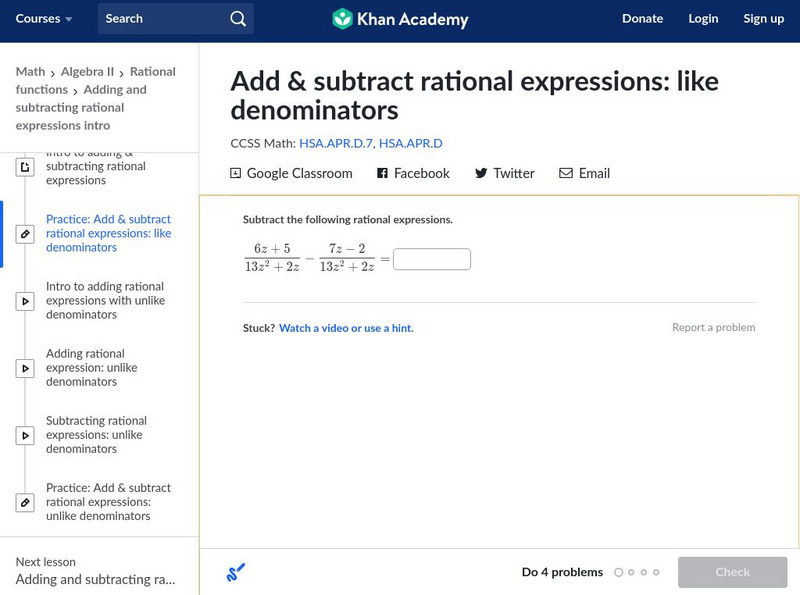 Check your understanding of how to add and subtract rational expressions that have like denominators with these problems. Students receive immediate feedback and have the opportunity to try questions repeatedly, watch a video, or receive...