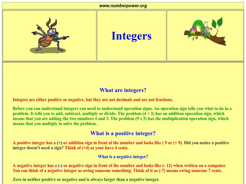 Numberpower answers "What are integers?", "What is a positive integer?", and "What is a negative integer?". You will also find integer multiplication, integer addition, and integer subtraction rules, with examples.
