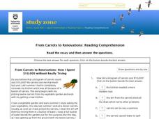 In this reading comprehension worksheet, 6th graders read a selection titled, "From Carrots to Renovations: How I Spent $10,000 Without Really Trying," then answer 5 fill-in-the-blank questions.