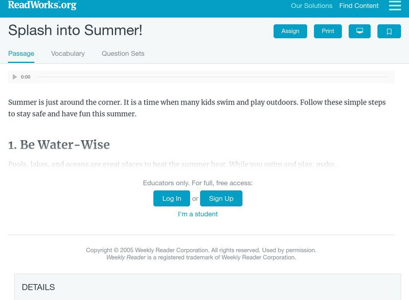[Free Registration/Login Required] Students read about safety tips for the summer. A question sheet is available to help students build skills in author's purpose.
