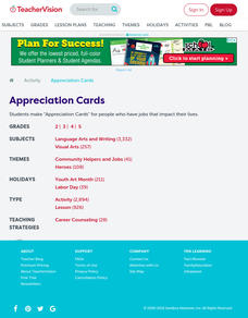 Students discuss jobs in which have impacted their lives directly. They create appreciation cards for a person who they believe needs appreciation. They give their cards to that person and share their reaction with the class.