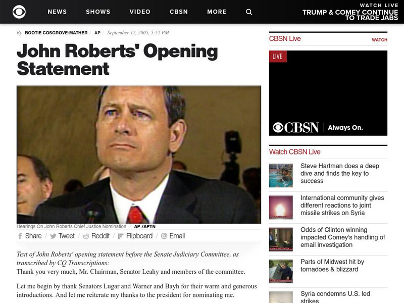 This is the text of John Roberts' opening statement before the Senate Judiciary Committee in 2005. The site also offers today's live news feed.