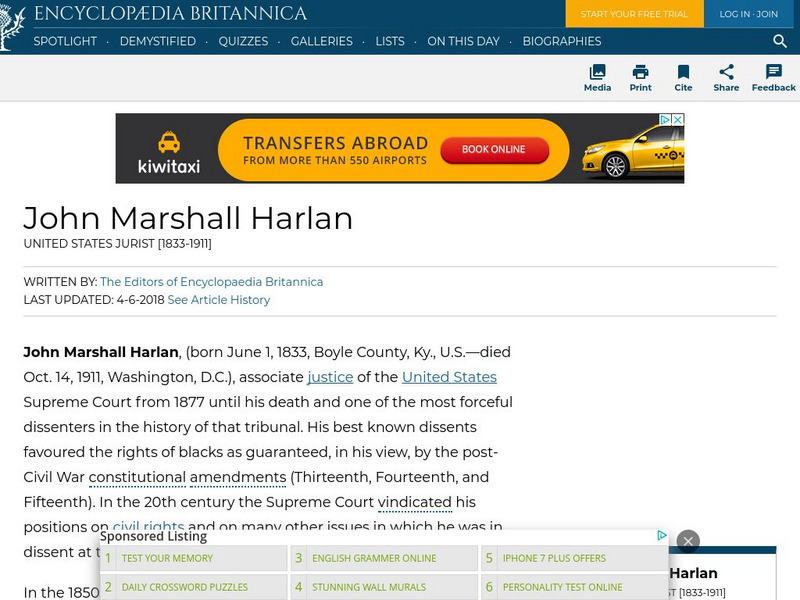 This entry from Encyclopedia Britannica features John Marshall Harlan, an associate justice of the United States Supreme Court from 1877 until his death and one of the most forceful dissenters in the history of that tribunal. His best...