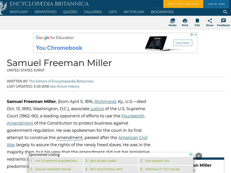 This entry from Encyclopedia Britannica features Samuel Freeman Miller, an associate justice of the U.S. Supreme Court (1862-90), a leading opponent of efforts to use the Fourteenth Amendment to the Constitution to protect business...