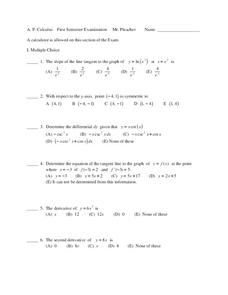 In this calculus exam worksheet, students solve 40 multiple choice and short answer problems. Students find derivatives, second derivatives, normal lines, slopes, etc.