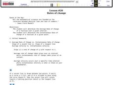 High schoolers investigate the rate of change and how it effects a function over a given interval. They examine the slope of a line that is seccant and how it is compared to a tangent line and then determine the changes of a function at...