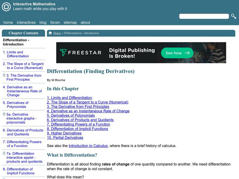 Explore the world of Calculus through differentiation. Focusing on areas such as limits, tangents to curves, and derivatives, this site shows you how to solve problems based on the discoveries of Sir Isaac Newton and Gottfried Leibniz....