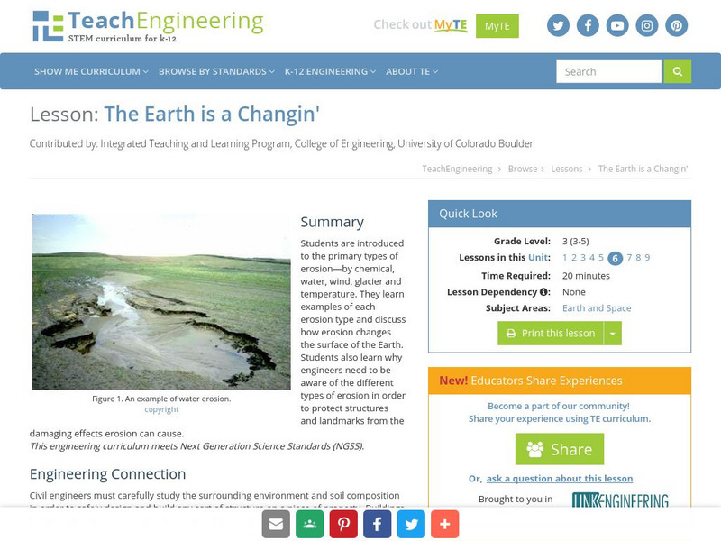 This lesson introduces and describes the main types of erosion (i.e., chemical, water, wind, glacier and temperature). Students learn examples of each type of erosion and discuss how erosion changes the surface of the Earth. Students...