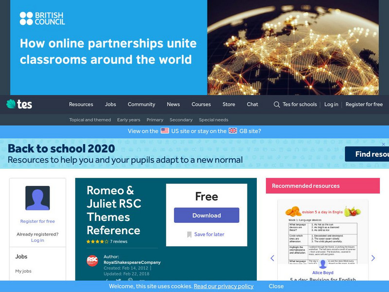 [Free Registration/Login Required] This is a printable reference guide for teachers listing the major themes and motifs in Romeo and Juliet and providing examples of scenes and quotes where you can find them. W.9-10.9a Analysis