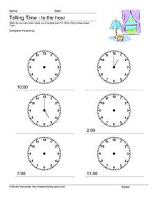 For this telling time worksheet, learners draw the hands if the time is given, or write the hour if the hands are given. Students complete 6 problems.